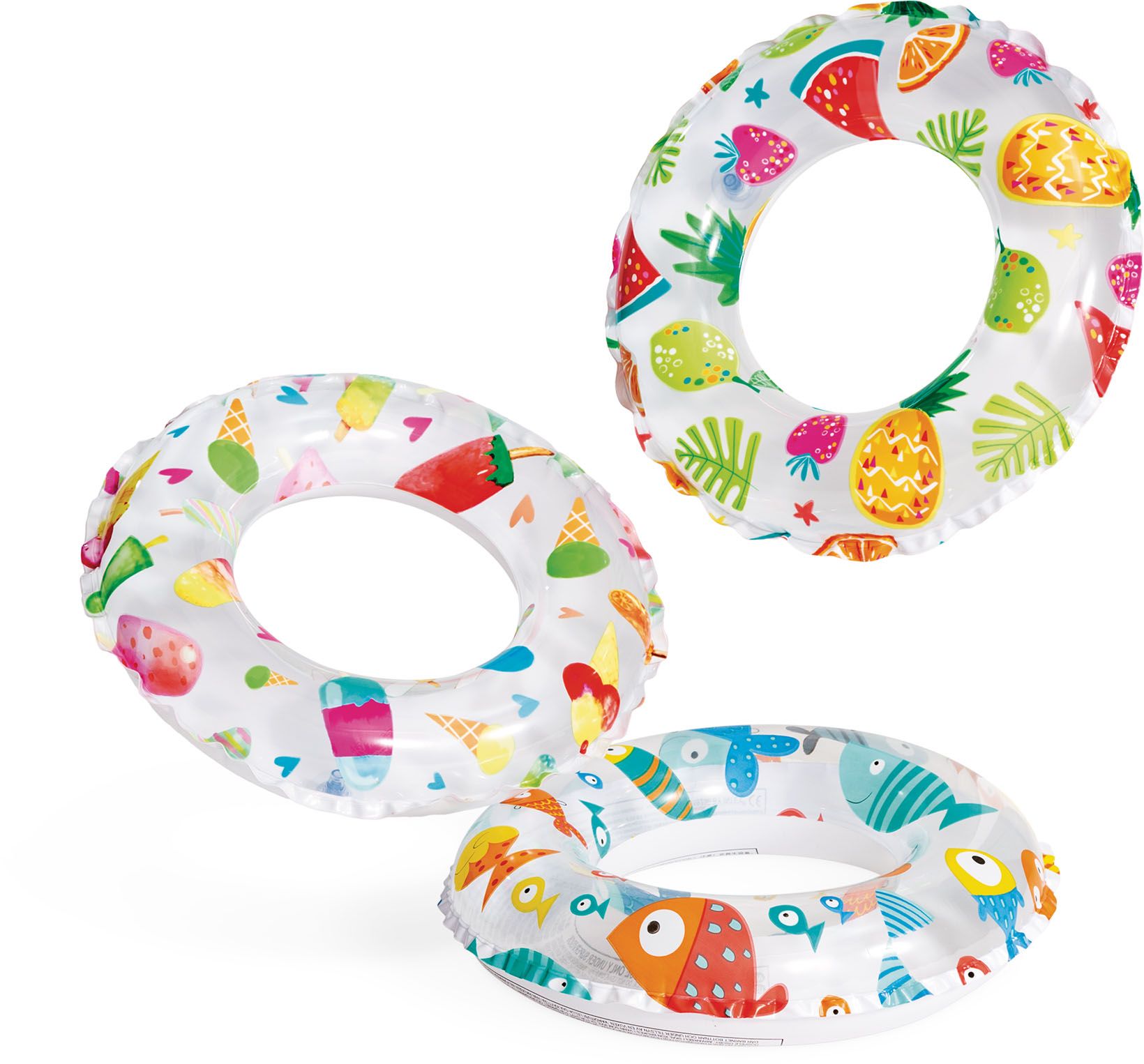 Φουσκωτή κουλούρα για παιχνίδι στην πισίνα. Με την Intex Lively Print Swim Ring, το παιδί σας θα μπορεί να παίζει στην πισίνα και να μάθει να κολυμπάει έχοντας την υποστήριξη της κουλούρας ως σωσίβιο. Διατίθεται σε 3 καλοκαιρινά σχέδια: Με καλοκαιρινά φρούτα, παγωτά και ψάρια.