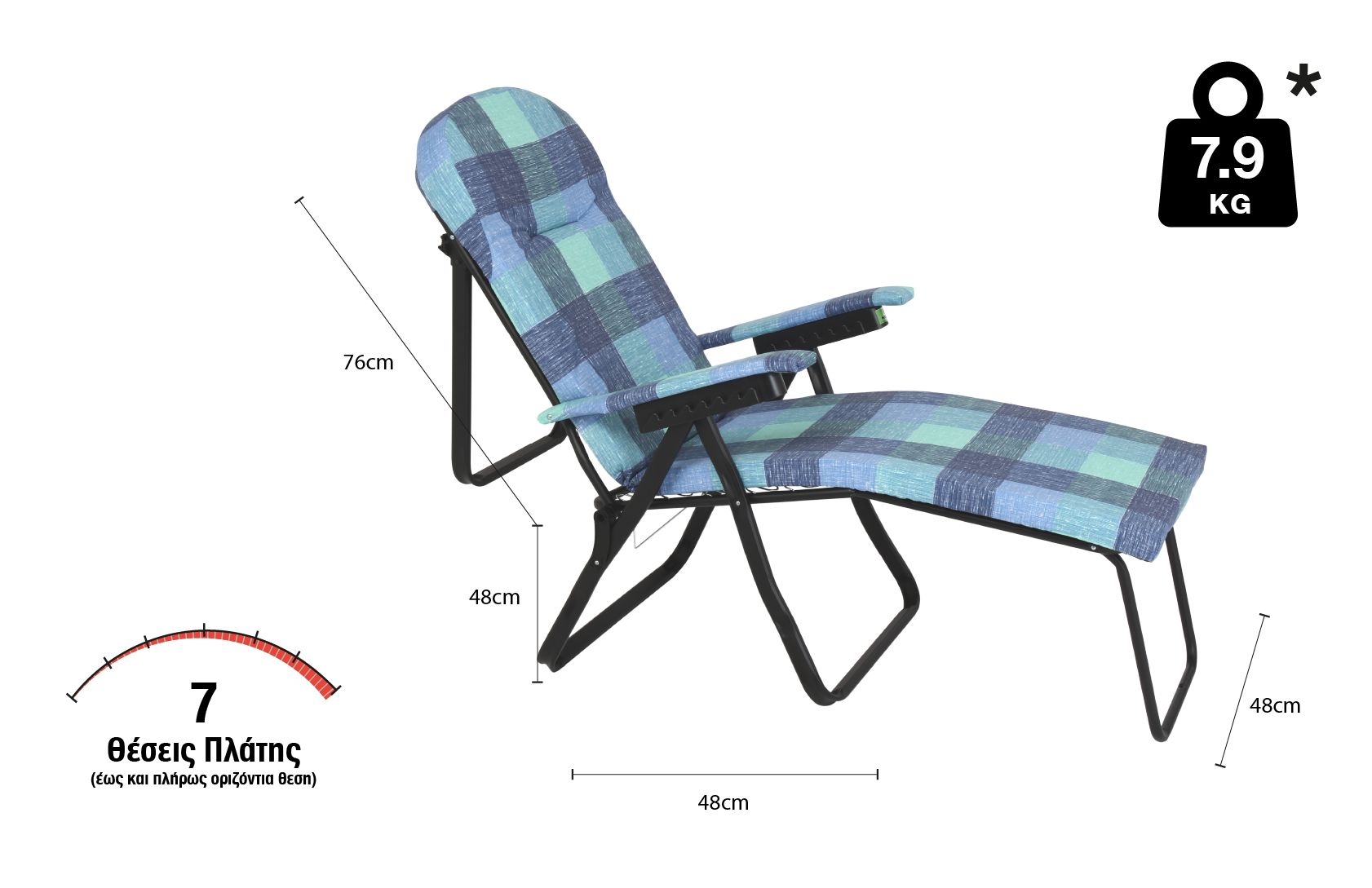 Συμπεριλαμβάνει μαλακό μαξιλάρι 5 εκατοστών καθώς και προσκέφαλο 26×8 εκατοστών. Η πολυθρόνα είναι κατασκευασμένη με οκτάγωνο σκελετό 36×20 χιλιοστών ιδιαίτερης αντοχής! Τα μπράτσα της είναι μεταλλικά με μεταλλικά δοντάκια για πολύ μεγάλη αντοχή και σιγουριά κατά την αλλαγή των θέσεων. Ευρωπαϊκής κατασκευής (Ιταλία)