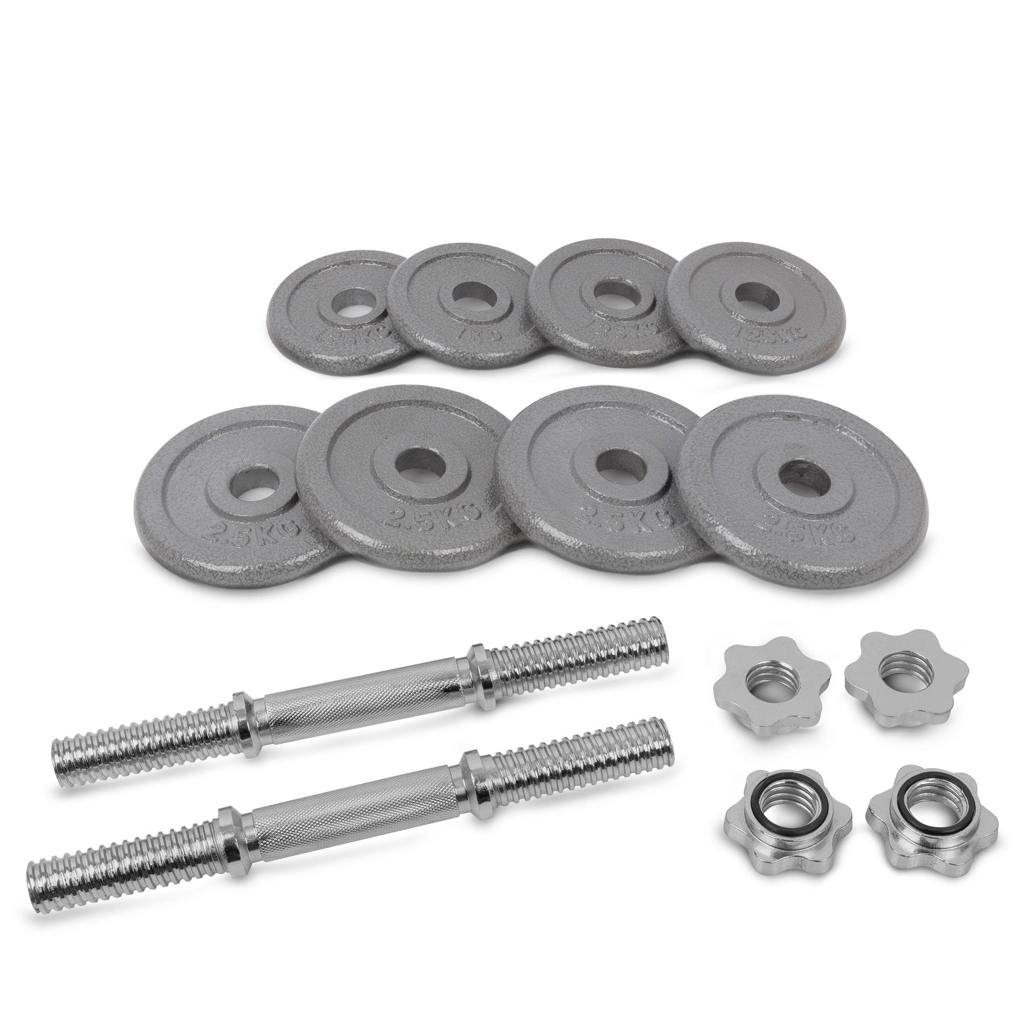 Δίσκοι: 4 x 1.25kg, 4 x 2.50kg Αλτηράκια: 2 τμχ. 350x30mm, 4 κολάρα αστέρια Συσκευασία: Πλαστικό κουτί με χερούλι