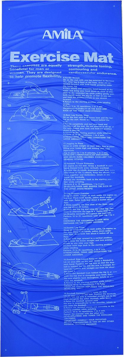 Το Floor Exercise στρώμα γυμναστικής της Amila από PVC είναι εξαιρετικά ανθεκτικό και προσφέρει ικανοποιητική απορροφητικότητα κατά την διάρκεια των ασκήσεων εδάφους. Στην επιφάνεια του είναι τυπωμένος ένας αριθμός ασκήσεων για την καθοδήγηση σας.